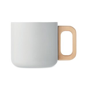 Double wall mug in recycled stainless steel (90% recycled stainless steel and 10% stainless steel) mug with wooden handle.