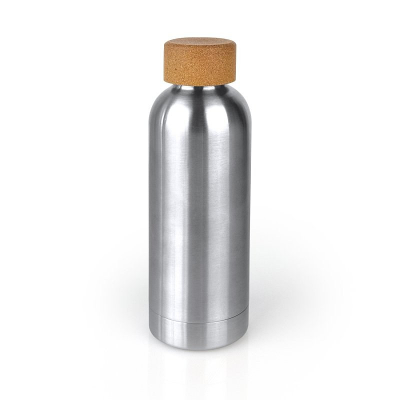 Single-walled water bottle made from recycled stainless steel, 750ml capacity, cork screw cap. Individually packaged.