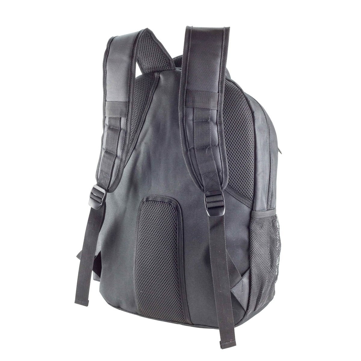 Backpack with large main compartment with double zipper closure and inside padded compartment for laptop. Two compartments with zipper closure. With padded back and adjustable shoulder straps with padding.