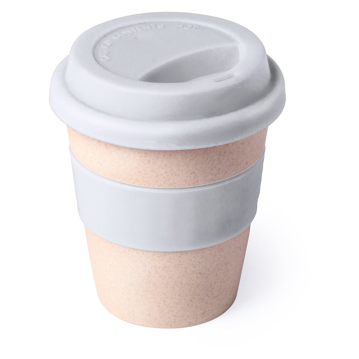 Cup in a combination of natural bamboo fibers and PP material. 380ml capacity, with body in natural color with silicone center band and lid in matching color silicone. Available in a wide range of colors.