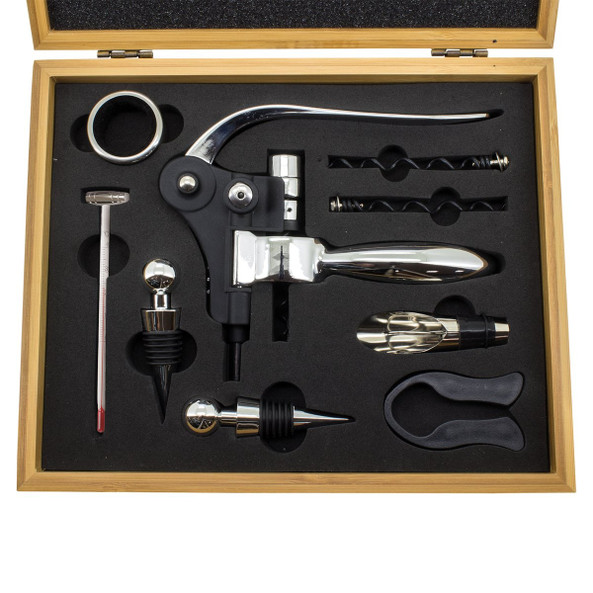 Wine set in bamboo box, includes lever corkscrew with two self-tapping screws, thermometer, two stoppers, pourer, capsule cutter, drip catcher