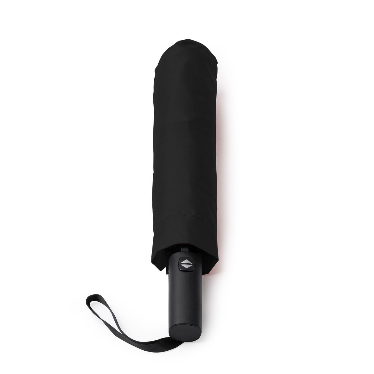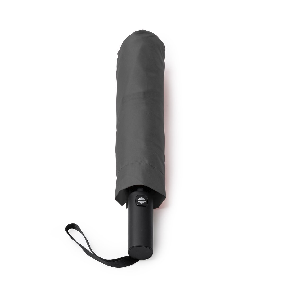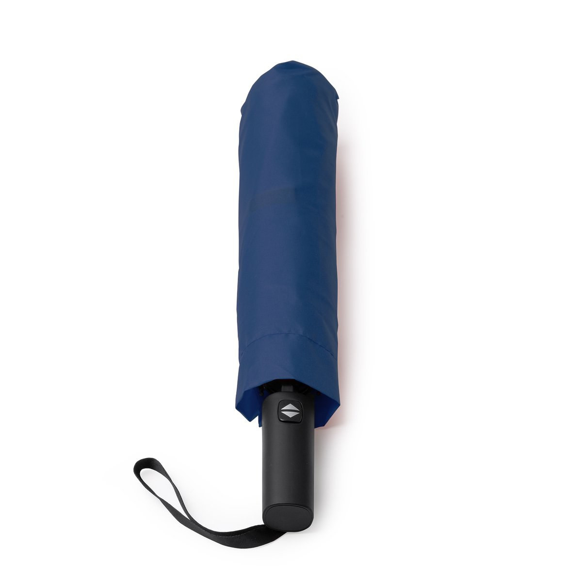 Foldable umbrella with automatic opening, rubber handle. 190T pongee fabric with coordinated pouch. Metal alloy shaft and fiberglass ribs.