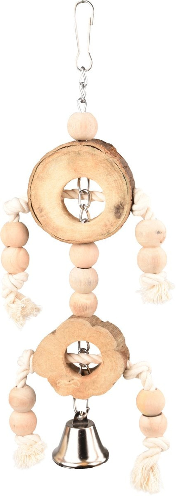 Vous voulez rendre la cage de votre oiseau encore plus amusante pour lui ? Alors, ce suspendeur de cage avec des lments en bois, une corde solide et une petite clochette est trs amusant ! Le suspendeur a une longueur de 37,5 centimtres.