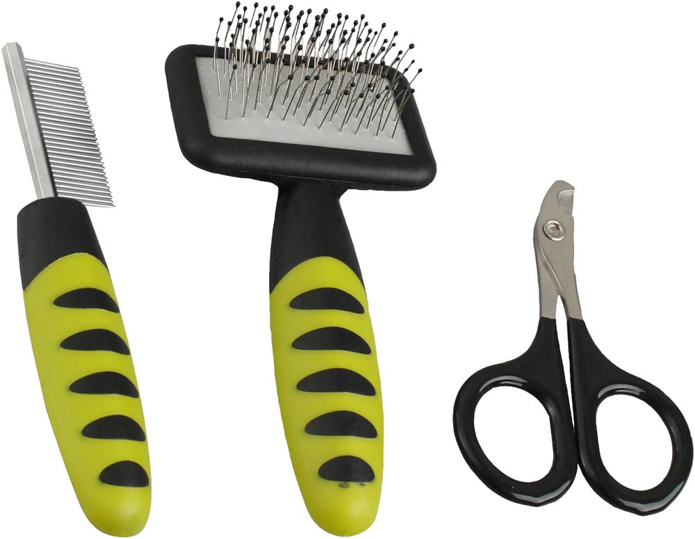 Maintenez le pelage de votre rongeur doux et brillant avec cet ensemble de toilettage 3-en-1. Dmlez les nuds avec les poils de la brosse et les pingles fines et courbes. Amliorez votre prise en main avec la poigne en caoutchouc et utilisez les ciseaux ongles avec poigne en inox et en plastique.