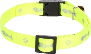 Ce collier jaune avec un motif d'artes de poisson pour chat est fabriqu en nylon. Le collier est rglable et possde une clochette pour avertir les oiseaux et autres animaux lorsque le chat est proximit. Le collier est quip d'une fermeture de scurit qui permet de le dtacher immdiatement si le chat reste coinc quelque part avec le collier.