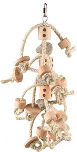 Ce porte-jouet pour cage est parfait pour les oiseaux plus grands. Le porte-jouet pour cage mesure environ 50 centimtres et est quip d'lments stimulants. Des blocs de bois en bois sr et rongeable ont t utiliss. Tout cela est nou avec de la corde sur laquelle votre oiseau peut aiguiser son bec pendant qu'il joue. Un lment amusant pour la cage d'oiseaux qui donne une apparence naturelle l'habitat de votre oiseau.