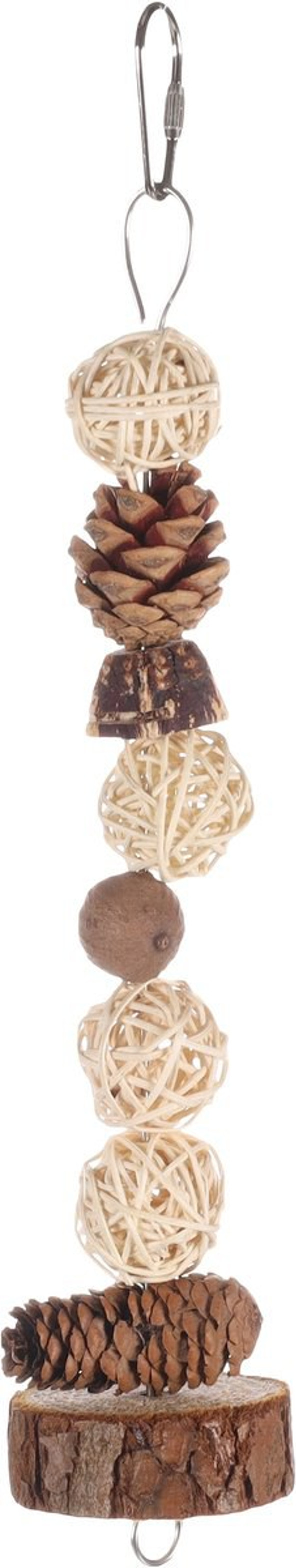 Faites plaisir votre perruche avec le jouet Biru Brun ! Il est fabriqu partir de matriaux naturels tels que le cne de pin, le rotin et le bois de mahogany. Il contient des balles, des cnes de pin et des perles sur lesquels votre perruche pourra grignoter volont. Vous pouvez facilement l'accrocher grce son systme de suspension en mtal.