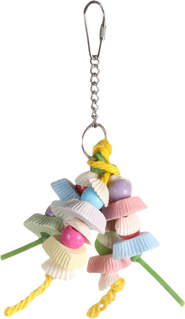 Rends ton perruche heureuse avec le jouet color Caly Multicolore ! Il est fabriqu en pltre, coquillages et cuir et contient des perles, des coquillages, des cordes et des morceaux de pltre grignoter. Accroche-le facilement avec le systme de suspension en mtal.