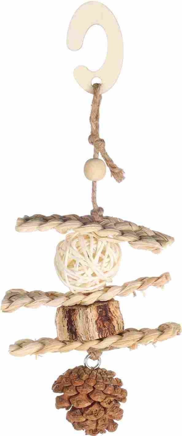 This snack toy is made from natural materials such as pine cones, corn leaves, rattan, hemp and nuts. It's ideal for snacking and promotes good dental health. The wooden hook makes it easy to hang.