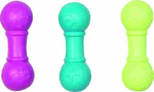 This rubber dumbbell is a great toy to take with you. Its shape makes it easy for the dog to pick up and carry. The material is strong and durable. A whistle inside adds even more fun. The toy is available in three colors.