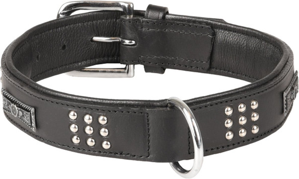 Ce collier pour chien est fabriqu en cuir vritable et est orn de jolis dtails argents. Le collier en cuir est de haute qualit et est quip d'une fermeture solide. Grce l'utilisation de l'anneau en D, le collier est facile attacher la laisse du chien. Disponible en plusieurs tailles et couleurs.