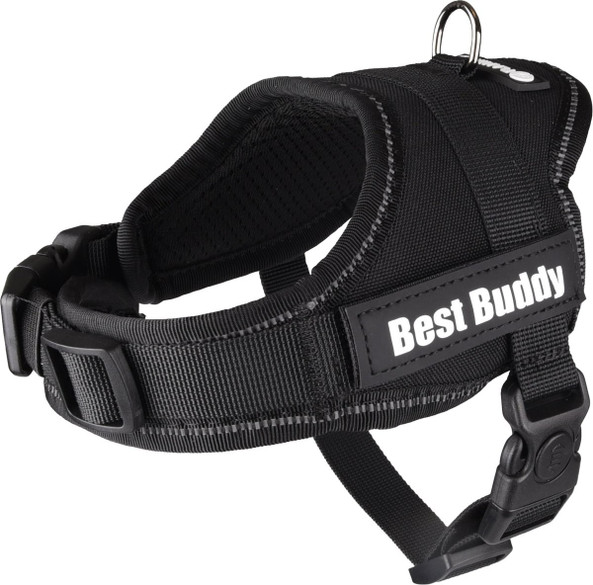 Le harnais noir Best Buddy Pluto est idal pour ton petit compagnon quatre pattes ! Il est fait en nylon et possde un rembourrage en mousse douce pour un confort supplmentaire. Le harnais est ajustable et comporte des bandes rflchissantes pour plus de scurit. Tu peux le fixer facilement avec la fermeture clic pratique et il y a un anneau pour attacher une laisse. Le harnais a une finition mtallique brillante de couleur gris fonc et une maille respirante pour la ventilation. Attention : la poigne ne peut pas tre attache aux tailles XXXS S.