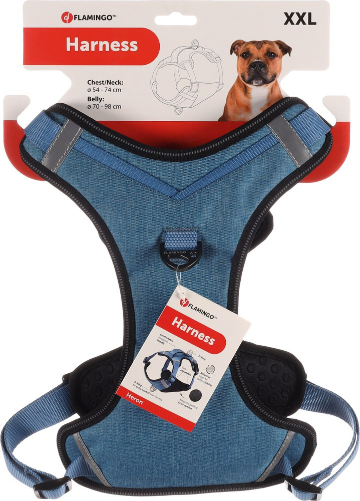The beautiful Heron dog harness is not only beautiful, but also comfortable and practical. This blue dog harness is made from polyester and finished with a neoprene lining, making it comfortable for the dog to wear. The Y-shaped dog harness has an ideal fit that offers plenty of room for movement while walking. Most dog harnesses have a chest band that hinders the dog during movement, but this Y-harness offers chest space while providing the control you need with shoulder straps. The dog harness is adjustable both on the shoulders and on the belly, making it well suited to the dog's morphology. This Y-style dog harness has 2 leash attachment points, so you can adapt it to certain training situations along the way. The handle on the top of the dog harness gives you extra control in case of emergency along the way. A perfect dog harness for safety and comfort, available in different sizes and colors.