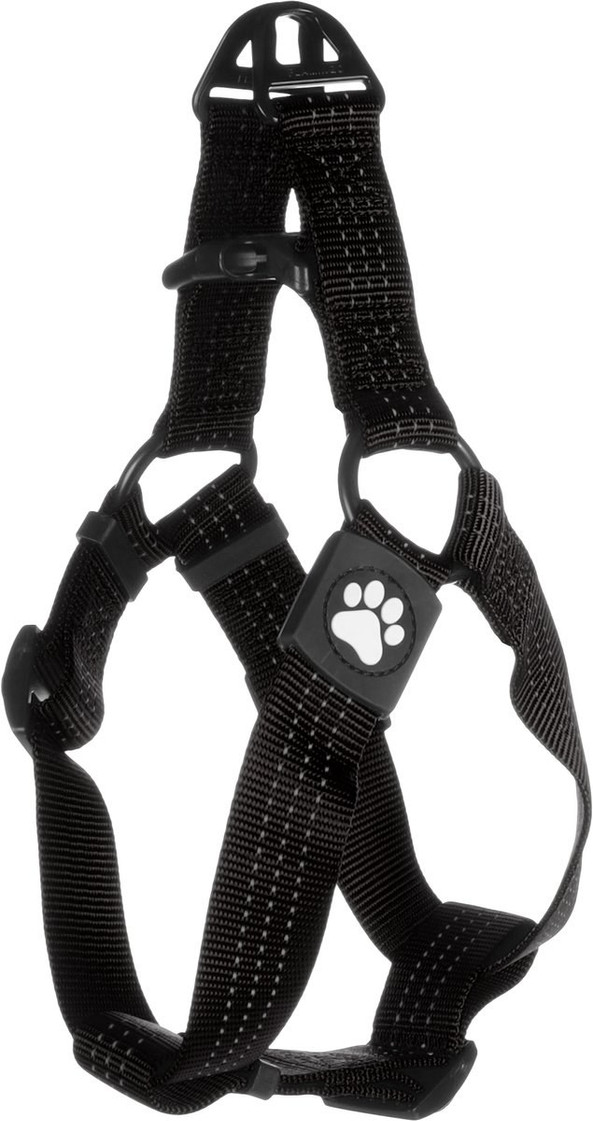 Ce harnais pour chien durable et ajustable est fabriqu en nylon solide. Avec sa fermeture clic pratique et son ajustement en continu, il convient parfaitement tous les chiens. Les anneaux mtalliques noirs mats et les bandes rflchissantes ajoutent un lment supplmentaire. De plus, les 2 anneaux offrent un soulagement de traction pour un confort supplmentaire.