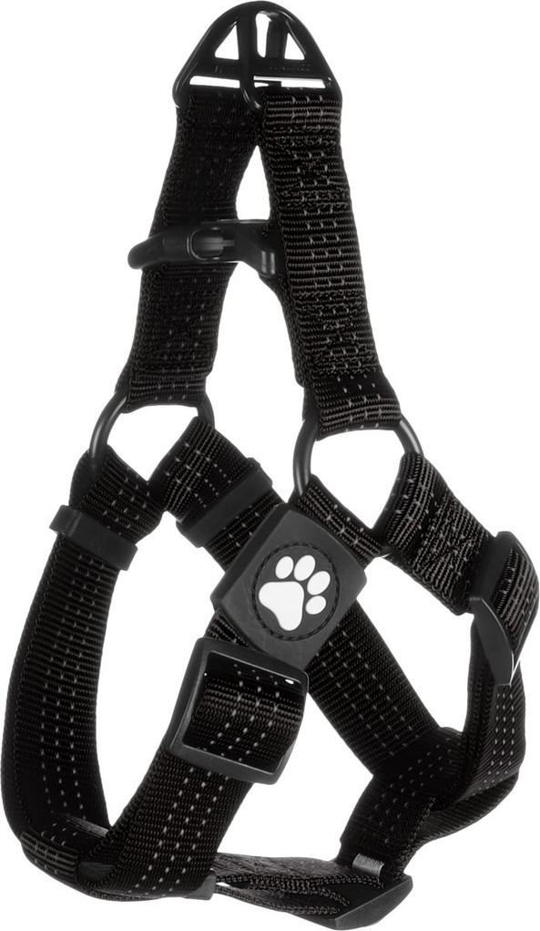 Ce harnais pour chien durable et ajustable est fabriqu en nylon solide. Avec sa fermeture clic pratique et son ajustement en continu, il convient parfaitement tous les chiens. Les anneaux mtalliques noirs mats et les bandes rflchissantes ajoutent un lment supplmentaire. De plus, les 2 anneaux offrent un soulagement de traction pour un confort supplmentaire.