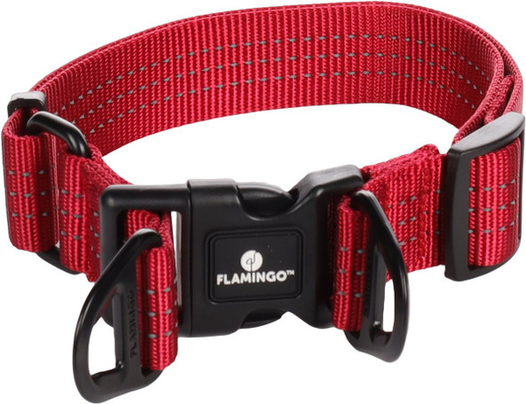 Ce collier de chien robuste et rglable est fabriqu en nylon durable. Avec sa fermeture clic pratique et son rglage en continu, il convient parfaitement tous les chiens. Les anneaux mtalliques noirs mats et les bandes rflchissantes ajoutent un lment supplmentaire. De plus, les 2 anneaux offrent un soulagement de traction pour un confort supplmentaire.