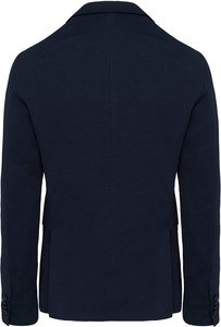 It has three pockets, two of which are piped, a chest pocket, three internal pockets, two of which are buttoned and one for a phone, and two slits in the back.