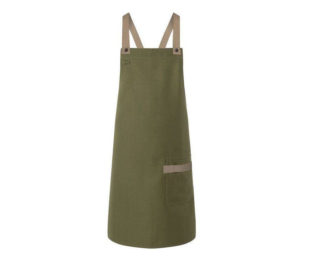 The Urban-Look bib apron with crossed straps and pocket KYLS38 is a modern apron produced by the Karlowsky brand . This model, made in an original style , comes with beveled edges at the ends of the apron, easily attachable and detachable straps with press studs , and removable ribbons in contrasting color. He likes cross straps in the back that you can adjust in length and height, you will be stylish, even behind your stove. Effective for covering your clothes while cooking, this apron has a 19x21cm left side pocket , with a contrasting color loop , to store your pens, tea towels or other kitchen utensils. This product is brought to you by the Karlowsky brand in standard size , with 5 different colors , including aubergine , pebble gray , cinnamon , steel blue and moss green .