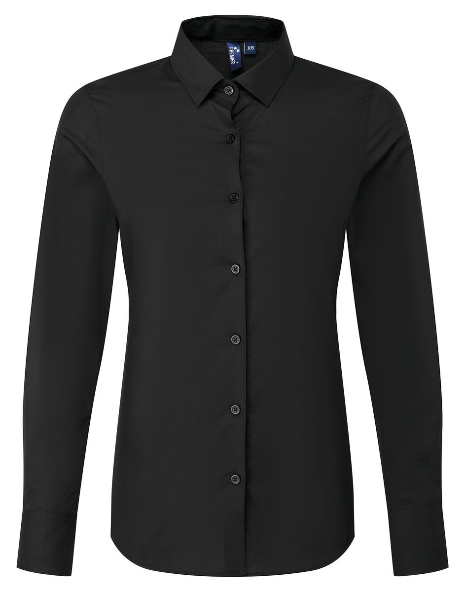 Soft collar, back darts and curved hemline.