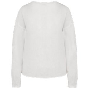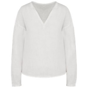 V-neck and placket with stitched bias finish and ribbed stitching.