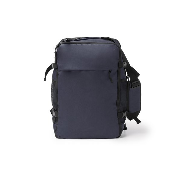Large capacity travel backpack made from 600D RPET with 180 degree opening.