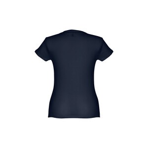 Women's fitted T-shirt in 100% cotton jersey knit (150 g/m²) with carded cotton yarn (colour 183: 90% cotton/10% viscose, colour 196: 98% cotton/2% viscose). Features a thin double collar in jersey reinforced by a satin bias tape. Cut and sewn garment with double stitched sleeve and hemline