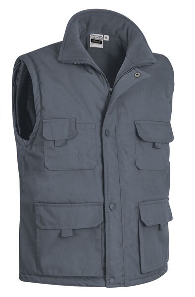 Padded Fleece-Lined Multi-Pocket Work Vest. Made of Canvas outer waterproof fabric, inner quilting and anti-pilling fleece lining that provides excellent thermal insulation. Stand-up collar with full-zip flap and snap matching button front closure, for warmth and comfort. Elasticated windbreaker on armholes and adjustable waist with side snap button fastening for a better fit.Four front velcro flap pockets, with a puller for easy opening, two pen holders and two side pockets for a secure and convenient storage. Includes an inside back zip for easy marking with different methods: screen printing, embroidery, transfer printing, shields, vinyl application. Ideal as workwear and uniforms.