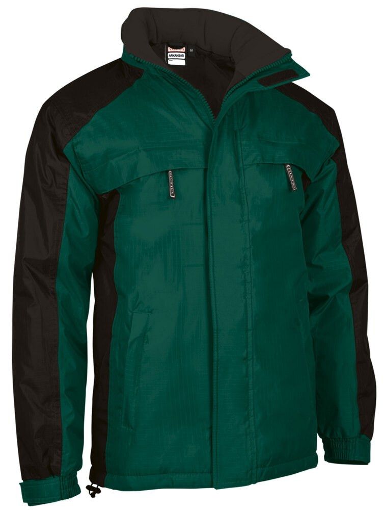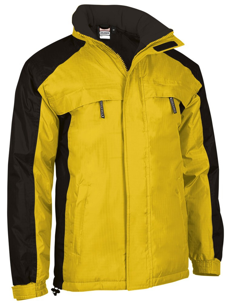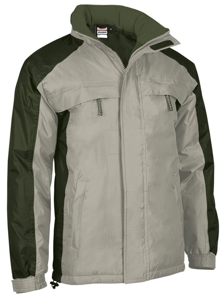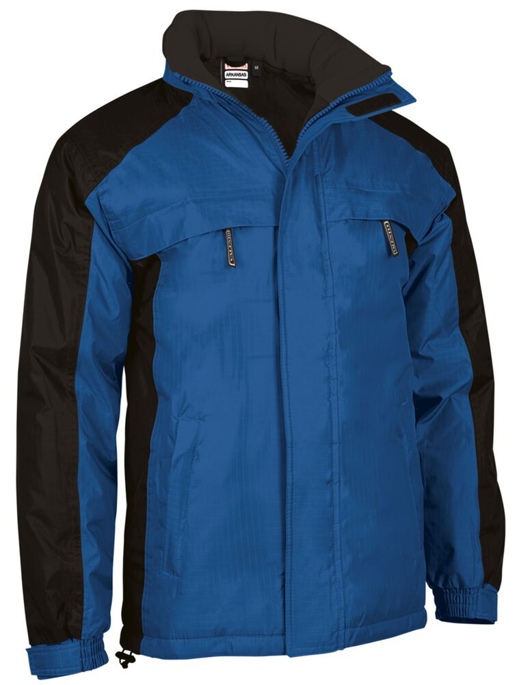 Two-Tone Waterproof Hooded Parka. Made of long-lasting Ripstop outer waterproof fabric with smooth inner lining, inner quilting and anti-pilling fleece lining on neck and pockets for ensuring excellent thermal insulation. Thermo-sealed seams that prevent water leaks and hidden hood that can be easily opened and closed by velcro closure and also can be used as a raincoat. Straight-cut waist with elastic drawstring and stopper, adjustable cuffs with velcro fastening for a better fit and added comfort. Two slanted waist pockets, two chest pockets and an inner left chest pocket, all zippered, for a secure and convenient storage. Includes an inside back zip for easy marking with different methods: screen printing, embroidery, transfer printing, shields, vinyl application. Ideal as promotional clothing, workwear and outdoor activities.